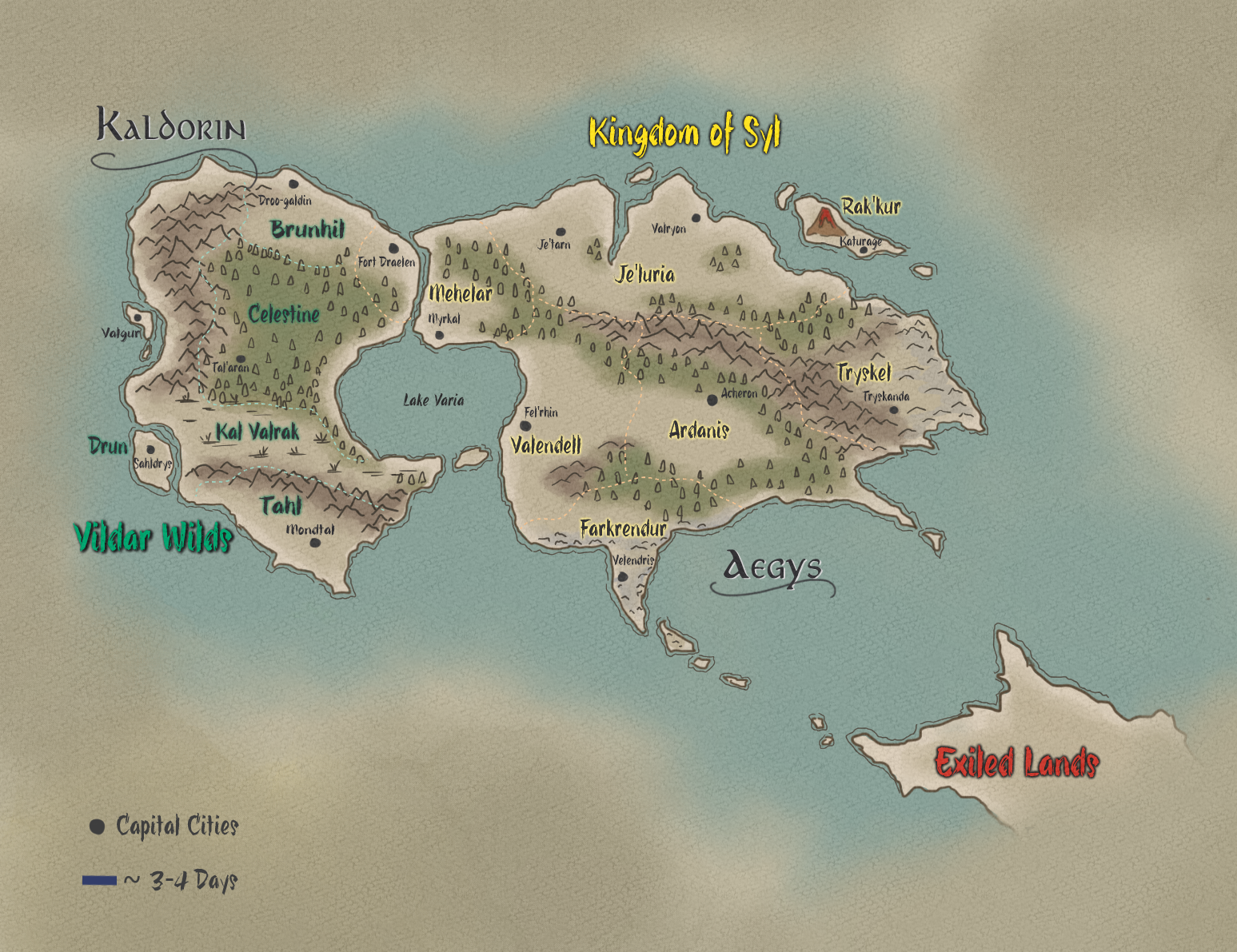 The capital of the Kingdom of Syl is Acheron and is currently ruled by King Sargos. The Kingdom of Syl spans across two continents: Aegys and Kaldorin. However, Kaldorin is mostly wild and the King faces many struggles in conquering the rest of the continent.